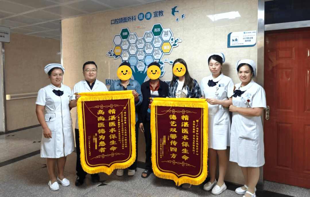 义诊期间,儿童颌面外科崔颖秋从任、邓云帆大夫细心评估小爱的环境后,正在本地团队的共同下成功为小爱取出了下颌骨牵引器,完成2期手术,此次手术的成功标记着小爱的小下颌正常获得了完全的改正,由此发生的临床症状获得了完全处理。为了表达谢意,小爱的父母特地制做了两面锦旗,现场抱住医护人员取易娱基金会的工做人员,虽然言语仍不相通,可是小爱妈妈眼里的泪水已然表达了万语千言。